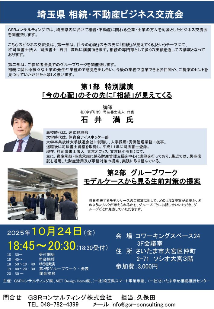 この度、(一社)埼玉県スマート事業承継では、4社共催にて、相続・不動産に関わるビジネスを埼玉県内で行っている企業・士業の皆さまを対象としたビジネス交流会を開催いたします。ビジネス交流会は、第一部 講演 …